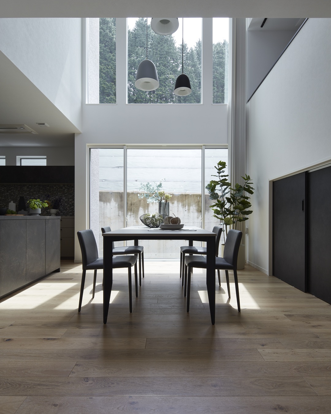 降り注ぐやわらかな光がリビングを明るく照らし、離れていても、やさしい繋がりを感じられる温かい空間です。