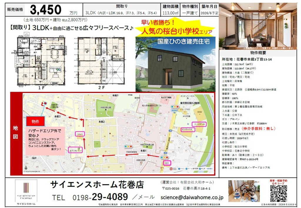 | タイトル | 《花巻市》【3LDK建売住宅】4/6~先行予約販売スタート*人気の桜台小学校区 |
