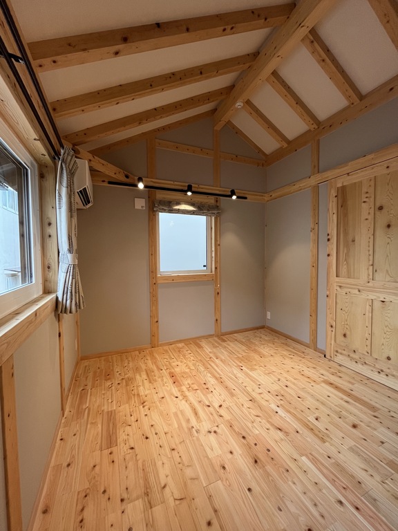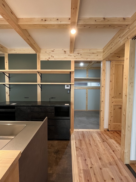 ✔️ 内装はナチュラルな塗装仕上げで木の温もりを感じる空間に。格子には空間を引き締めるブラック塗装を採用し、メリハリあるモダンな雰囲気に。
