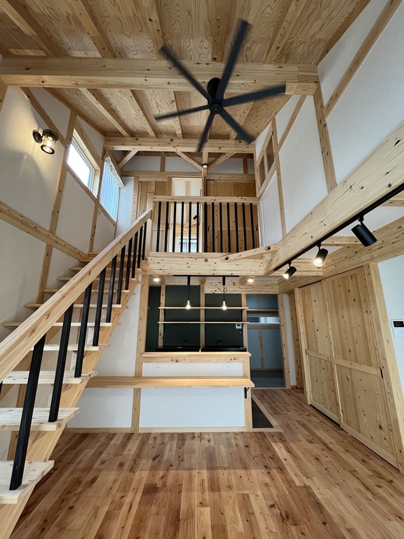 リビングには吹き抜けを設け、天井まで視線が抜けることで、実際の広さ以上の開放感を演出。光がたっぷりと差し込む、明るく心地よい空間に仕上がりました。