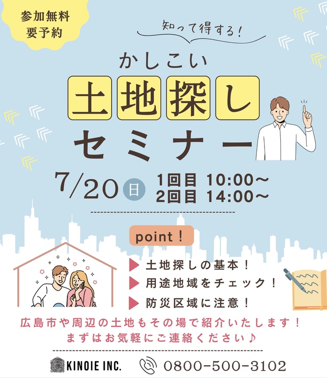 | タイトル | 【必見】かしこい土地探しセミナー!“7/20(日)” |