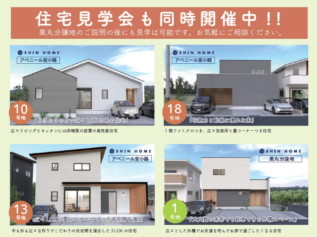 また同時開催をしている宮小路にはモデルハウスもありますので、完成物件を見学されたい方もお待ちしています。自由設計を検討中の方には分譲地からの案内も可能です。資金計画に不安のある方はライフプランより資金計画の相談も行います。