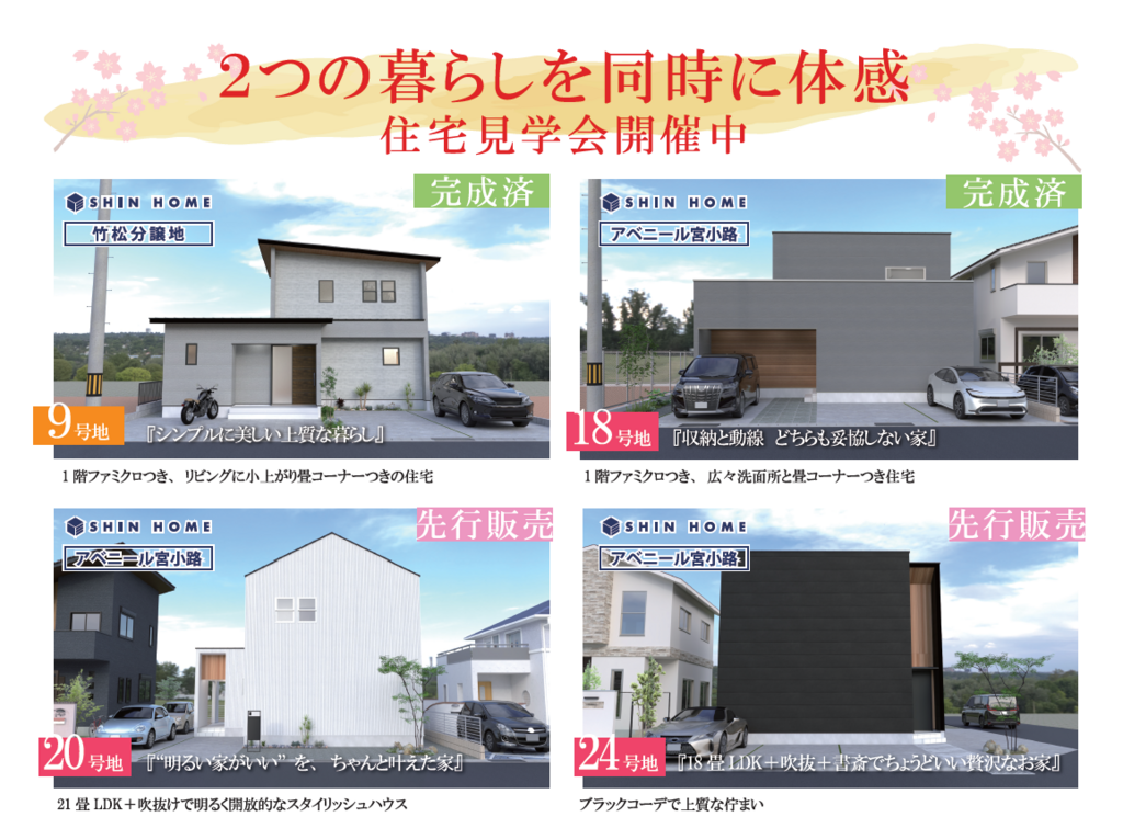 ・宮小路3丁目分譲地にて完成物件がありますので、先行説明会はこちらにて行っています。実際の建物を見学することができます。