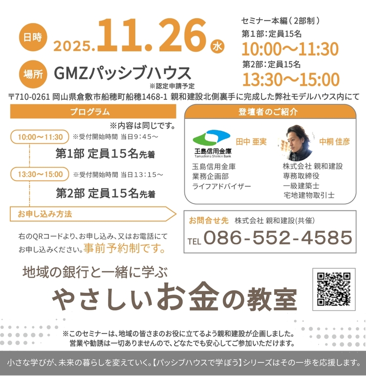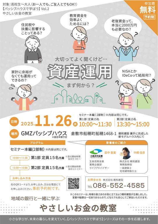 ※このセミナーは地域に根付いた企業として私たち親和建設ができることの一つとして開催致します。営業や勧誘等の行為は一切ございませんので、安心してお気軽にご参加ください。