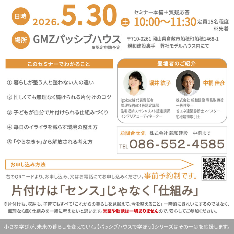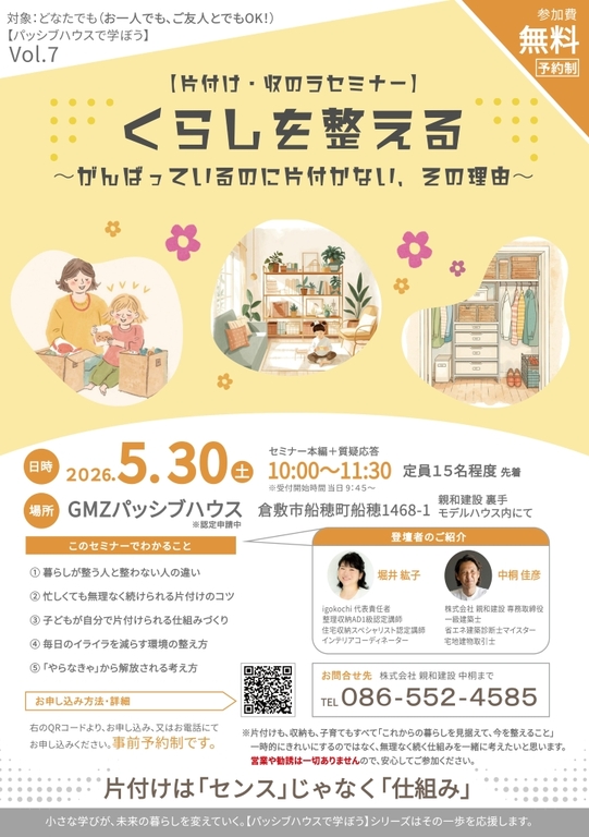 | タイトル | パッシブハウスで学ぼう Vol.7|くらしを整える【片付け・収納セミナー】 |