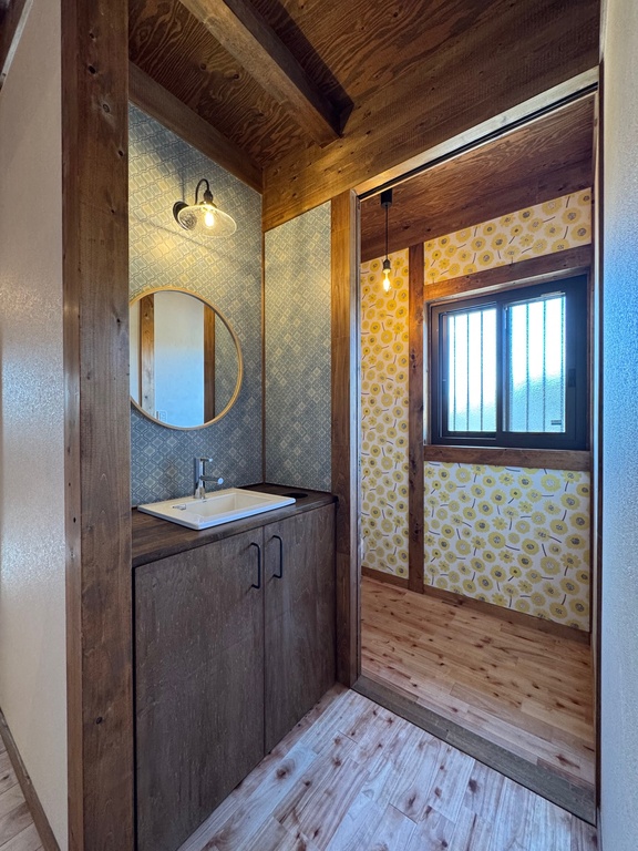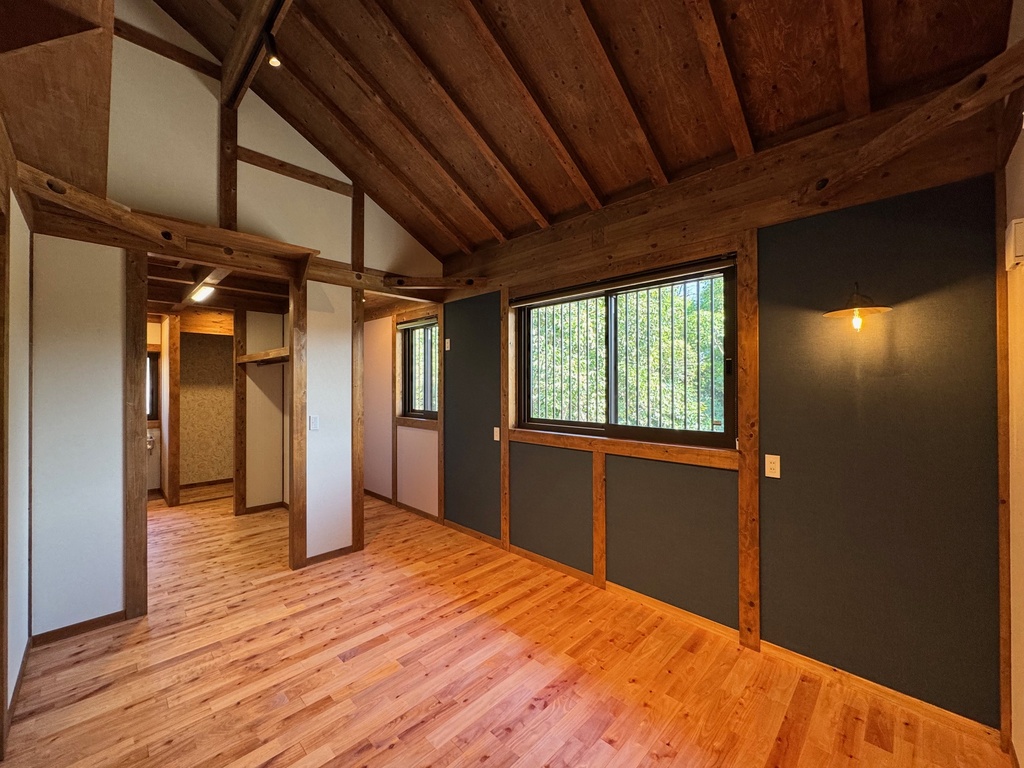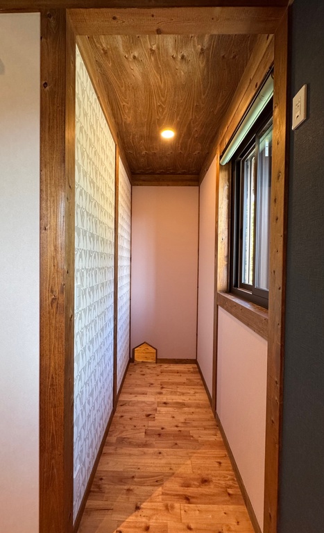 木組みの構造とシックな色合いの壁が調和し、ネコの毛も目立ちにくい実用性も◎。上質で穏やかな空気感が漂います。