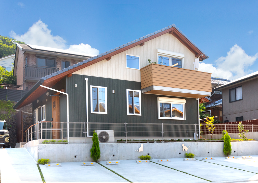 オシャレなツートーンの外観、コケに癒されるお庭。