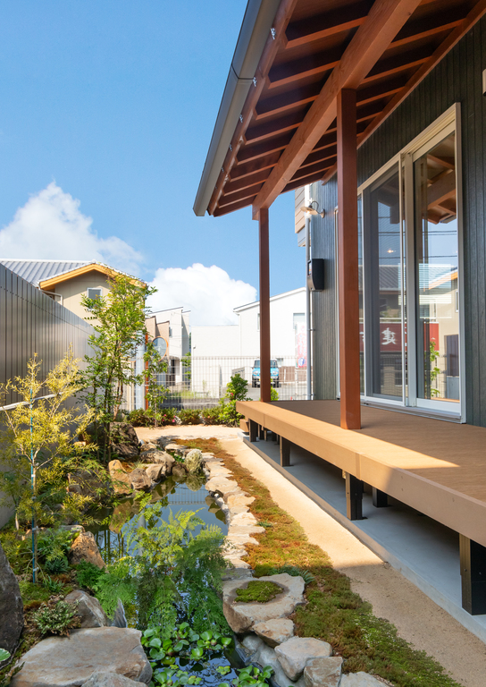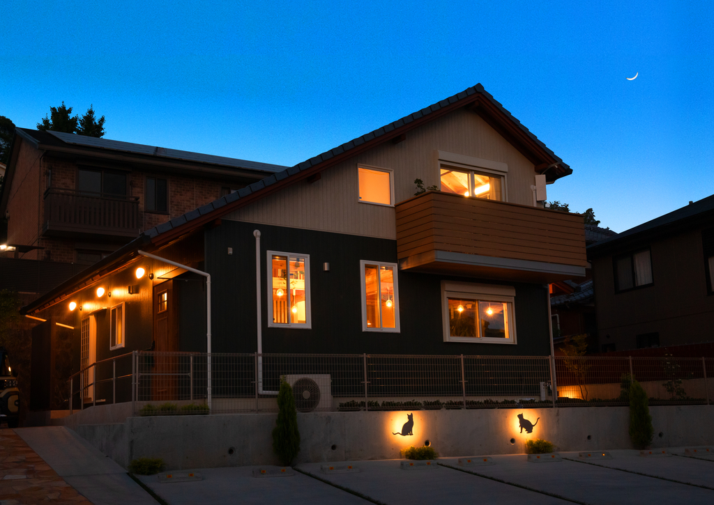 オシャレなツートーンの外観、コケに癒されるお庭。