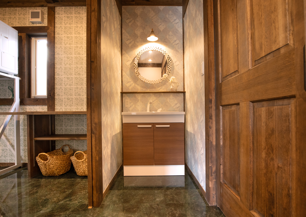・独立洗面所、作業台とガス乾燥機を備えた脱衣ランドリールーム