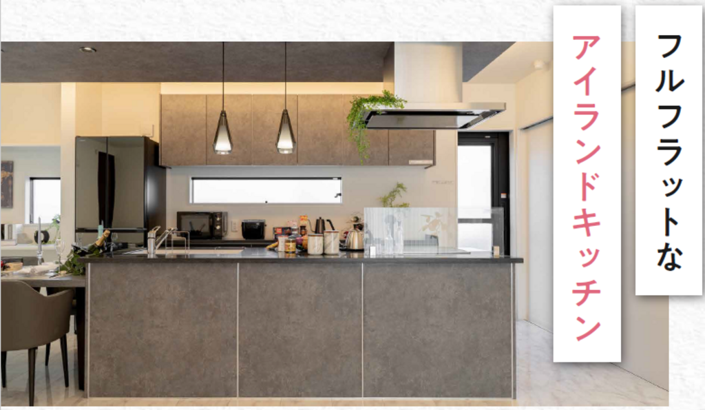 広々としたフルフラットなアイランド型キッチン