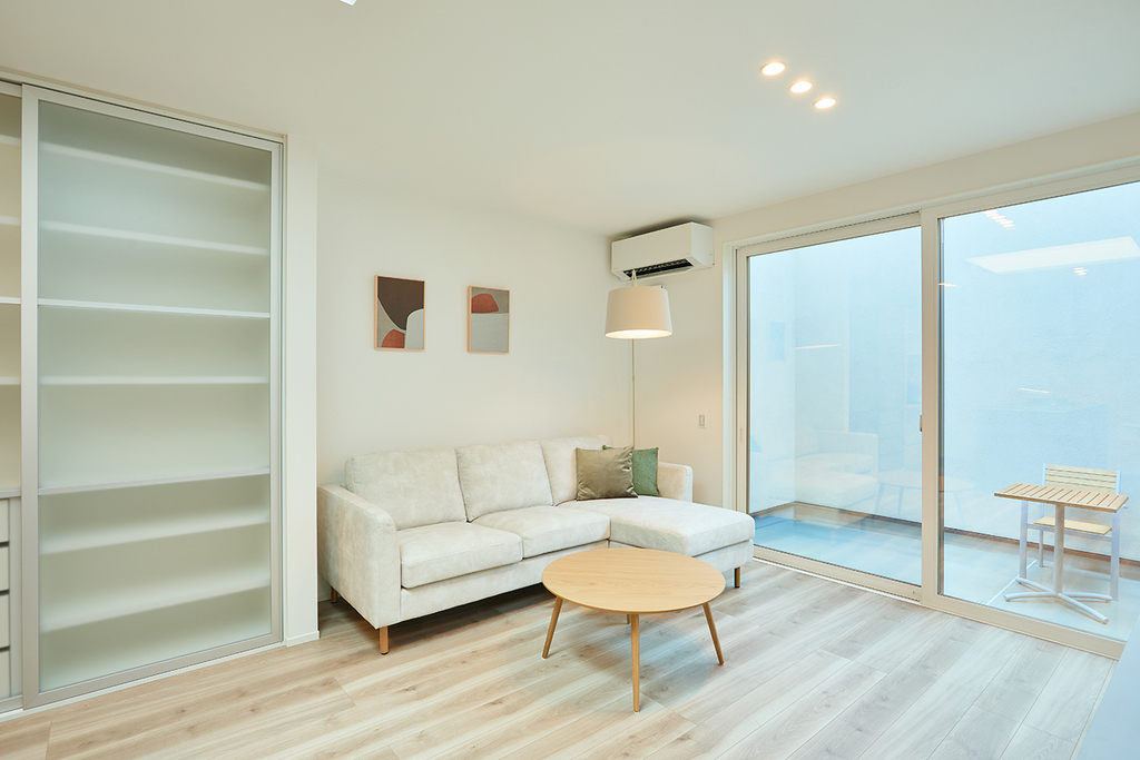 ヤードを囲う高い壁は、外部からの視線を遮るだけでなく、夏場の日射遮蔽の役割も果たします。1年を通して快適に過ごせるパッシブデザインを取り入れました。