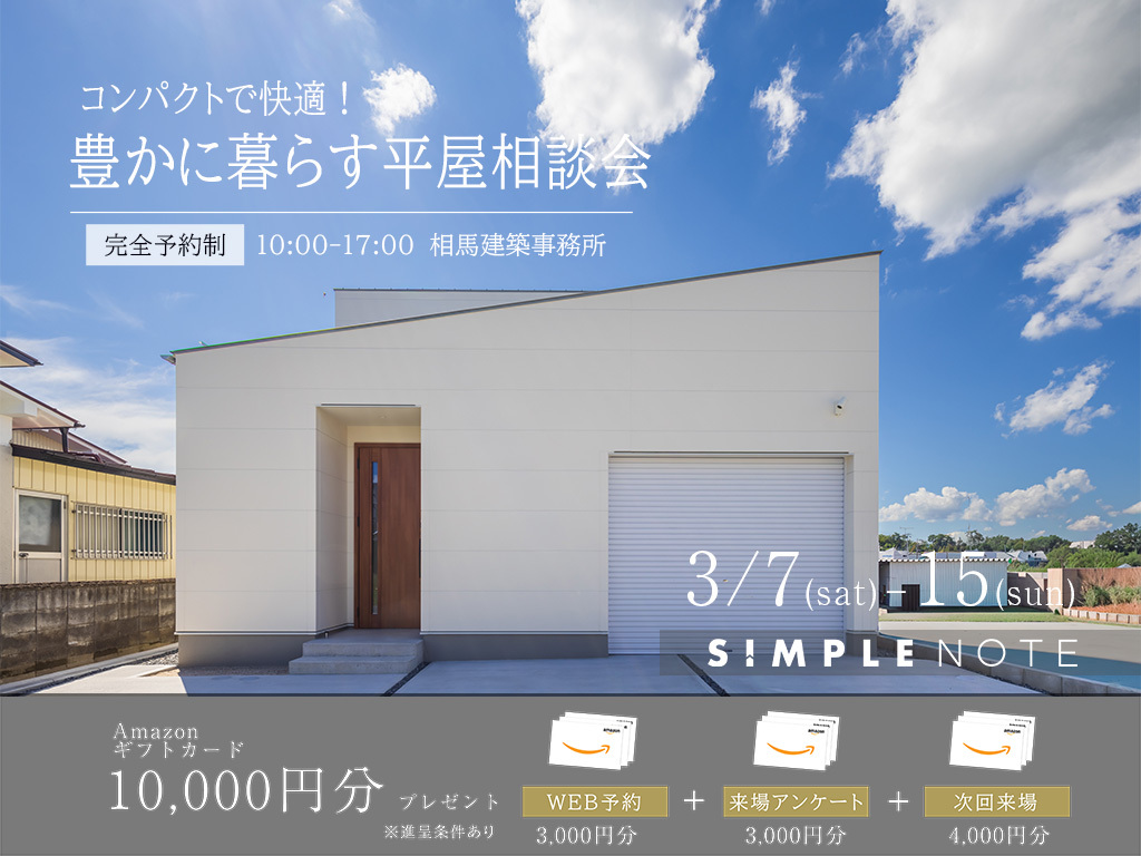 「無駄のない間取りで、家事も生活動線もラクにしたい」「将来を見据えて平屋を検討したい」そんな方に向けて、SIMPLE NOTE の平屋相談会を開催します。