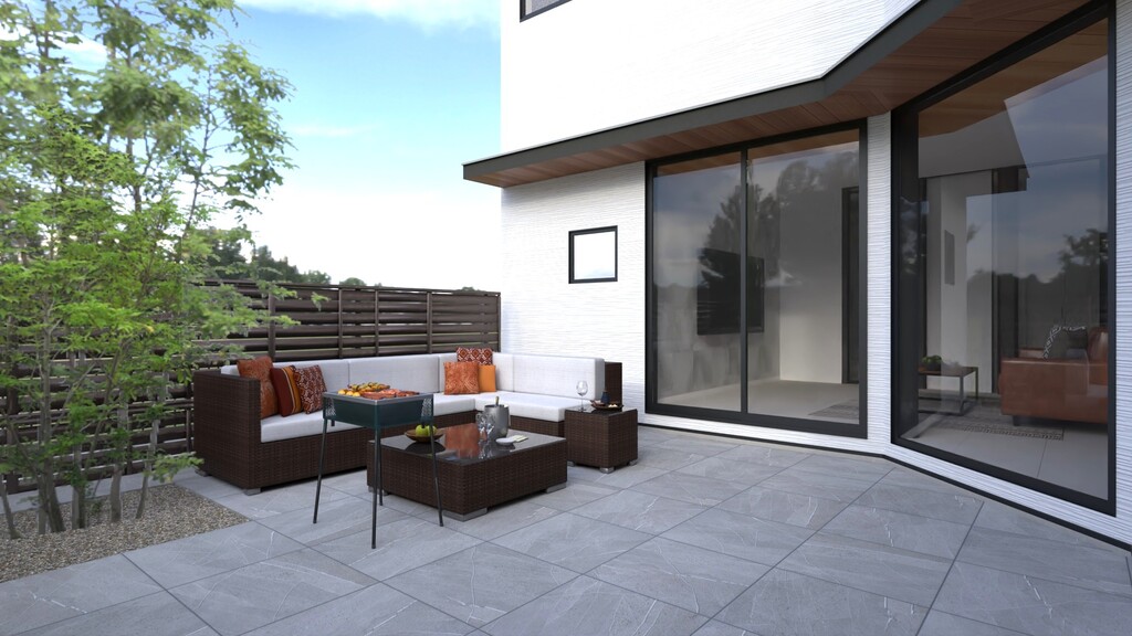 リビングとつながるテラスには、背の高い目隠しフェンスを設けて外部からの視線を遮り家族だけで安心して過ごせるようにしています。またラスとLDKが一体に感じられることで、季節や光を取り込む贅沢な空間になります。木目が映えるモノトーン空間で生活感を感じさせません。