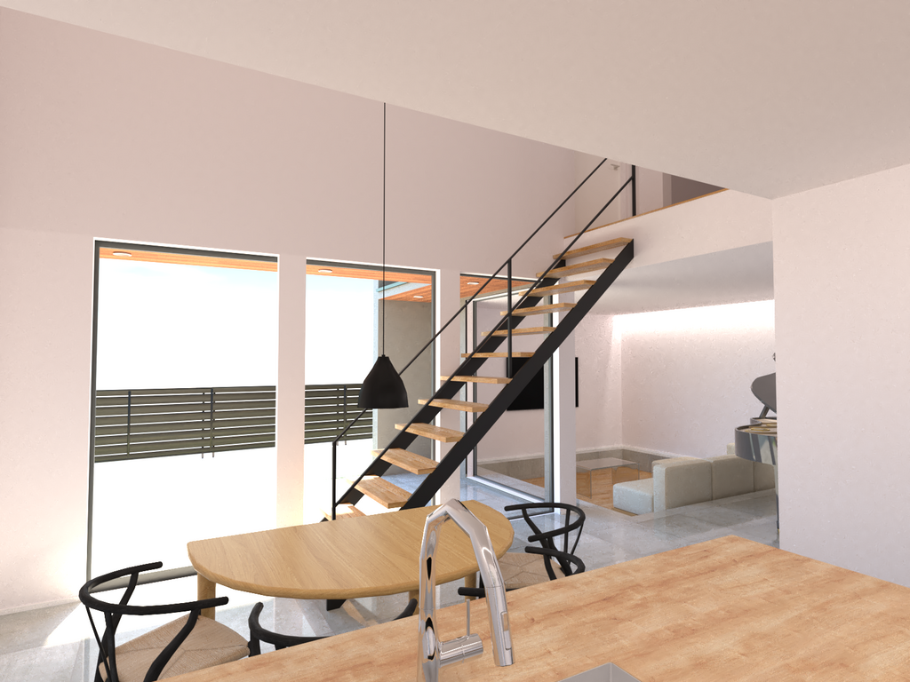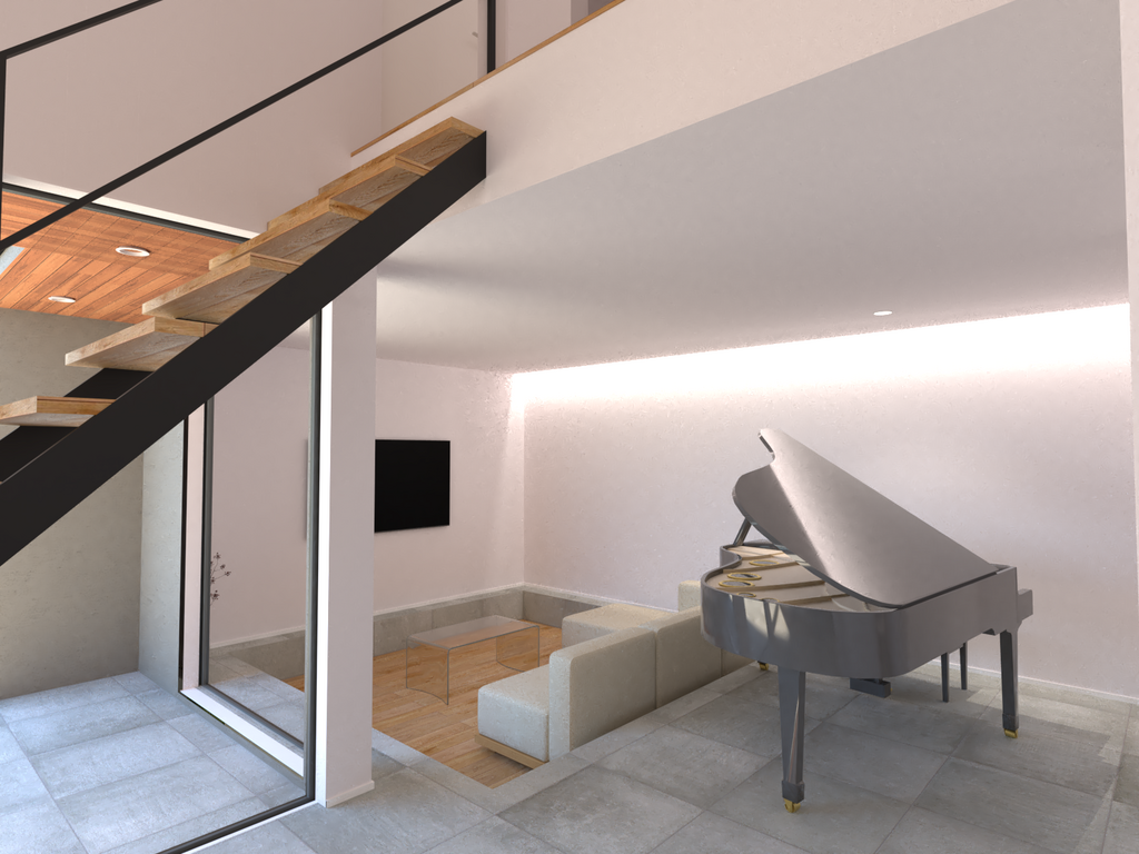 大開口の吹き抜けやアイアン製のオープン階段、グランドピアノを置けるピットリビング、