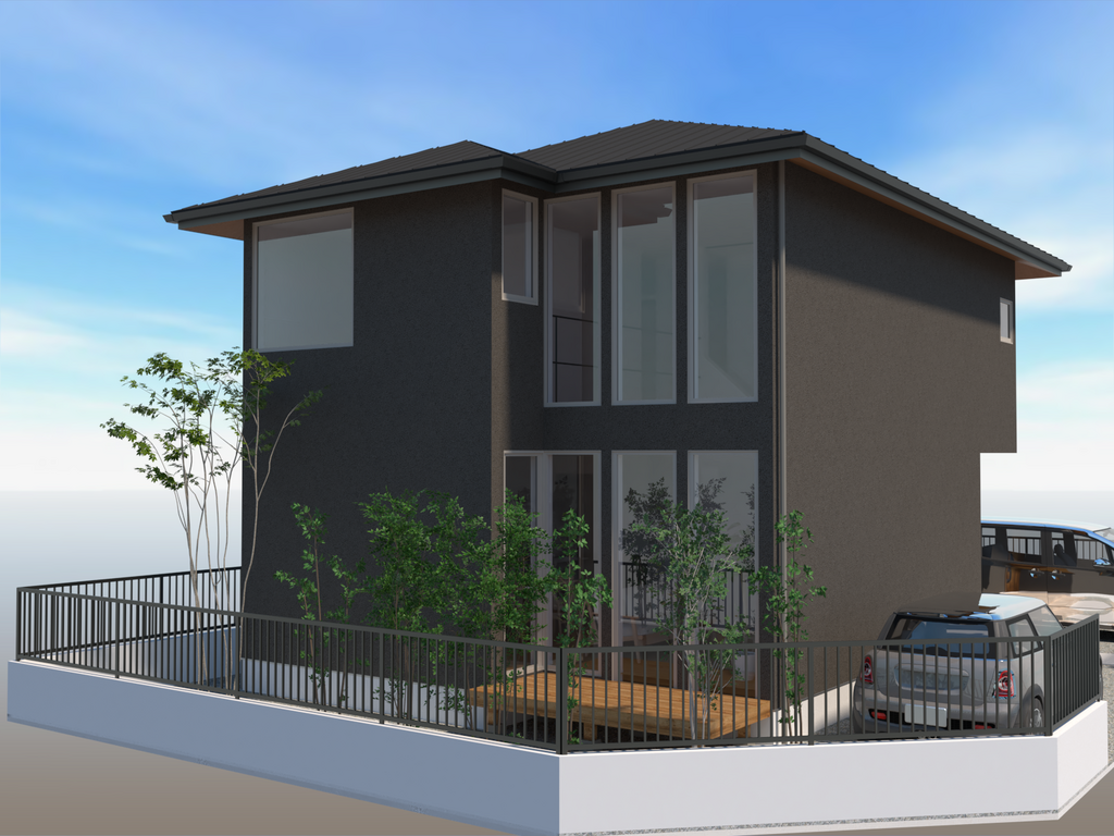 メンテナンス性を高め、長寿命な塗り壁の外壁が普遍的な美しさを纏う佇まいを演出。