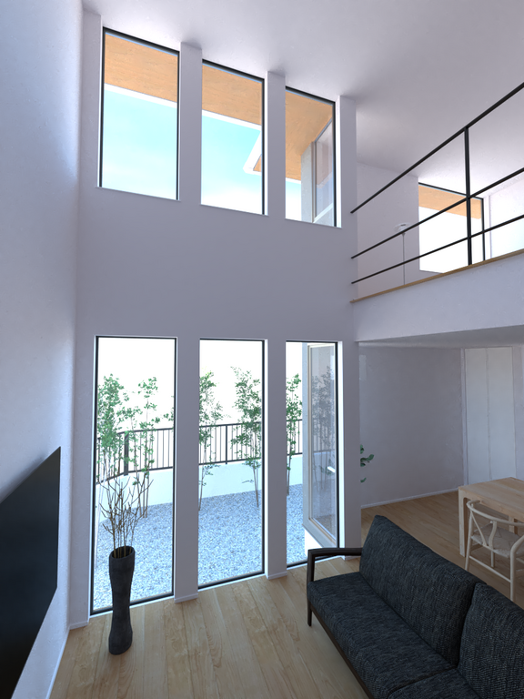 大開口の吹き抜けからは太陽の光がサンサンと降り注ぎ、開放感を感じるリビングに。