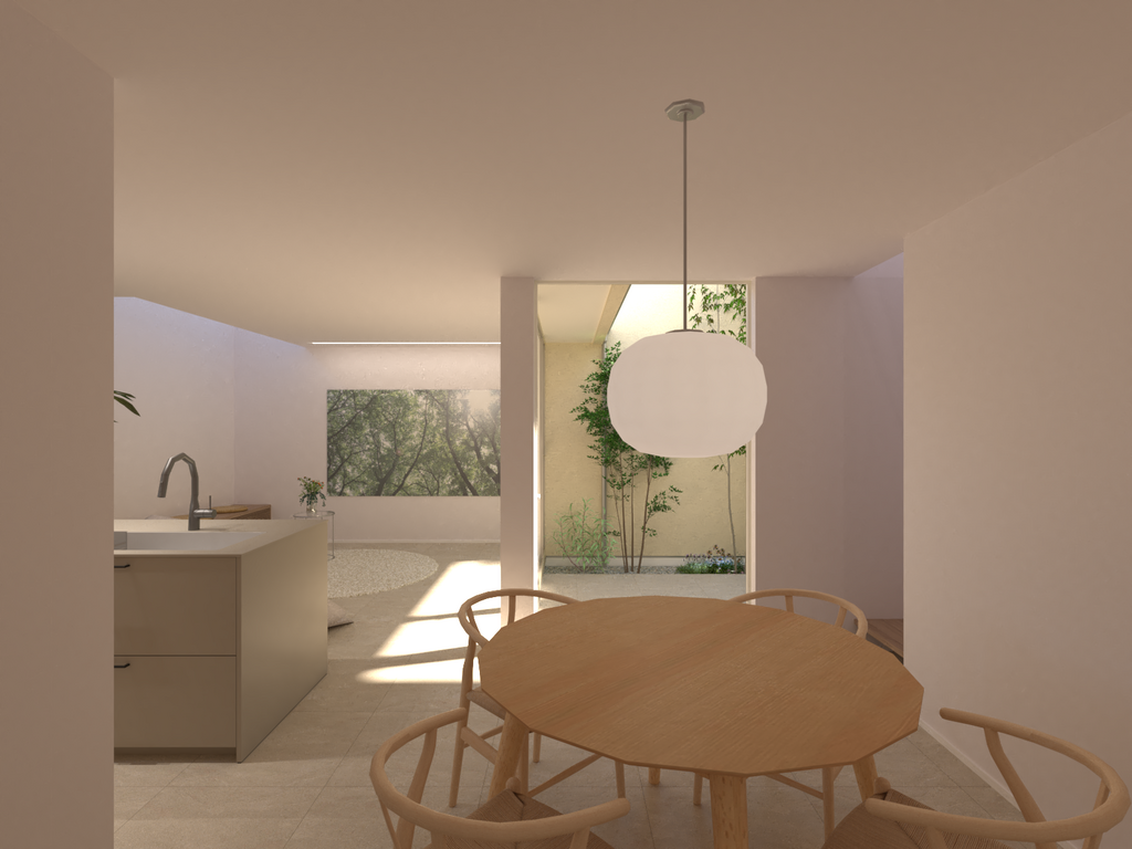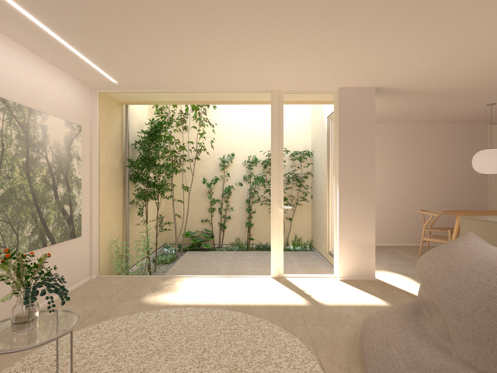 プライバシーの守られた中庭から太陽の光がサンサンと降り注ぎ、開放感を感じるリビングに。