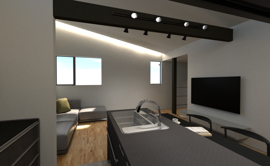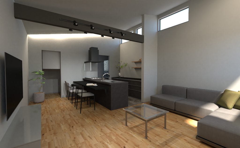 2階のリビングは青空を眺める高窓と広がりを感じる勾配天井を採用。