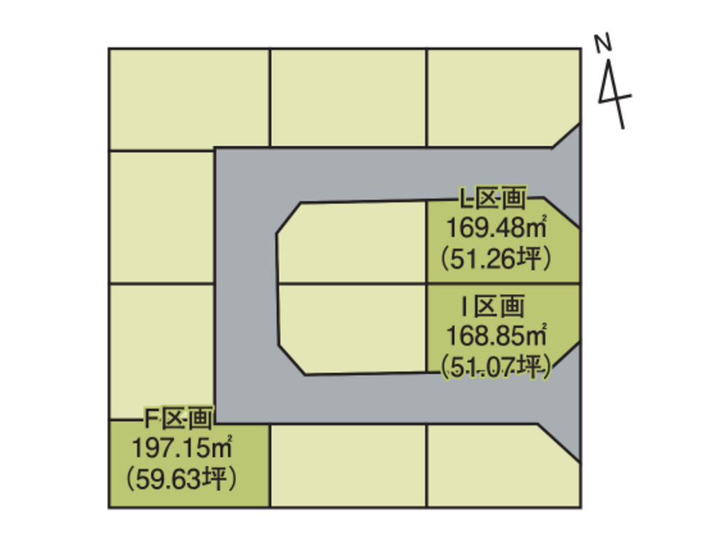 | 備考 | 建築条件付き【販売価格】 ・F区画:6,350,000円、197.15㎡(59.64坪) ・I区画:6,310,000円、168.85㎡(51.08坪) ・L区画:6,050,000円、169.48㎡(51.27坪) |
