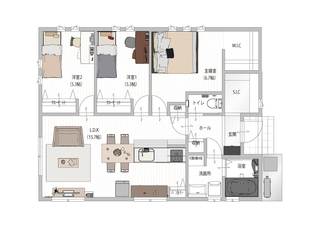 また、各居室のクローゼットに加え、洗面所やホール、リビングなど、必要な場所に豊富な収納を設けています。