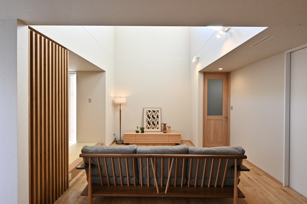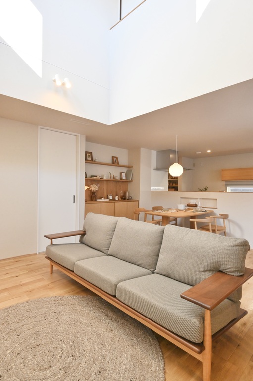 吹抜けからは自然光がやわらかく降りそそぎ、時間とともに表情を変えるリビング。