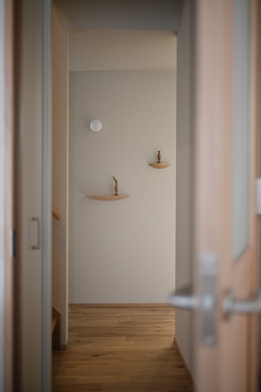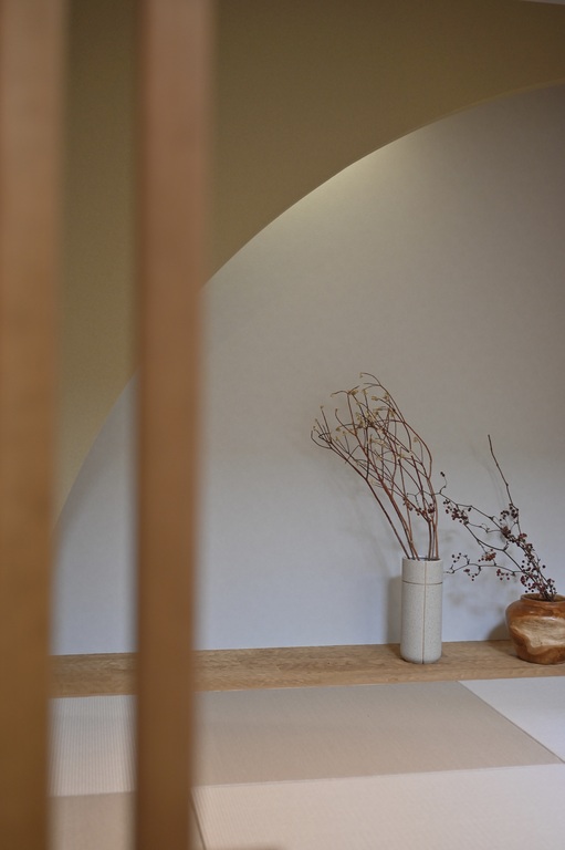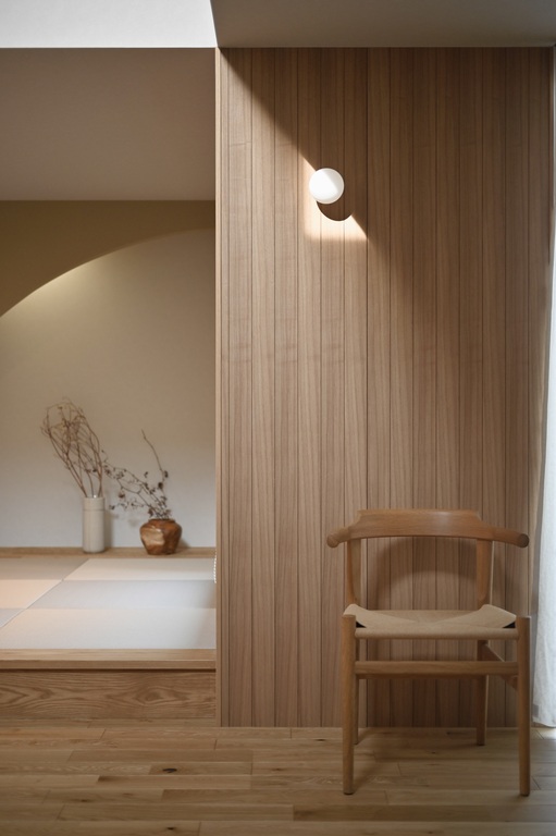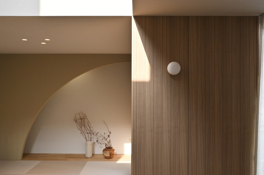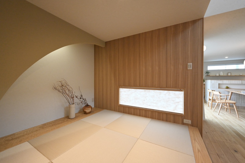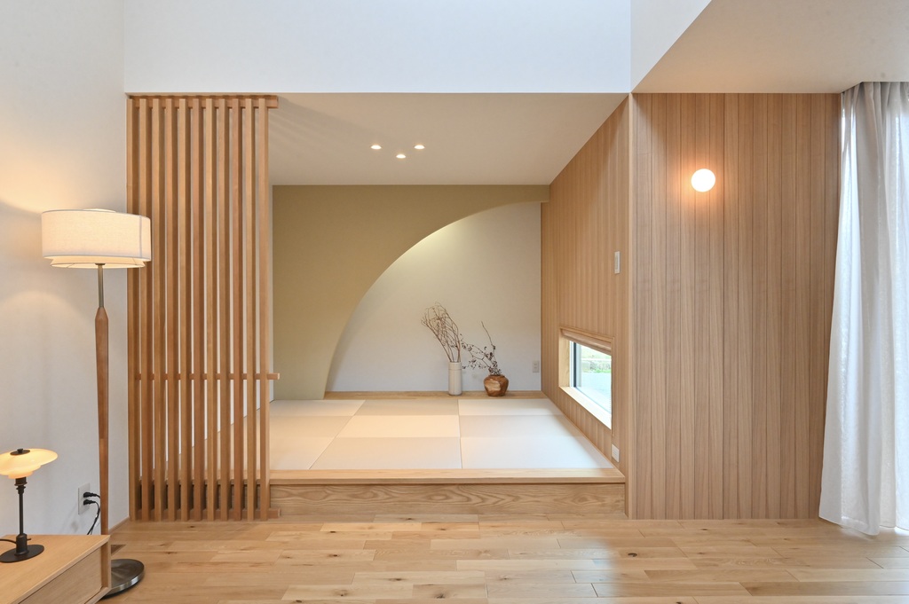 オークの床に、小上がりの和室、アールの壁が柔らかい影をつくり、