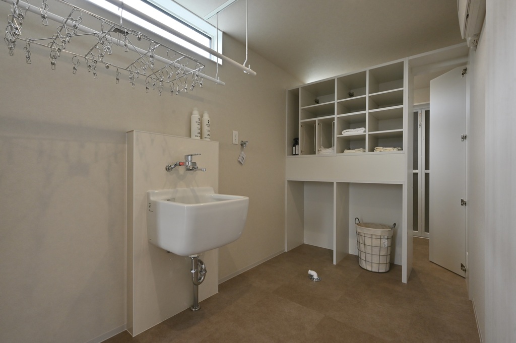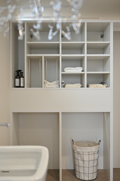 生活感を抑えつつ内部にはタオルや衣類を整理しやすい棚や仕切りを確保。