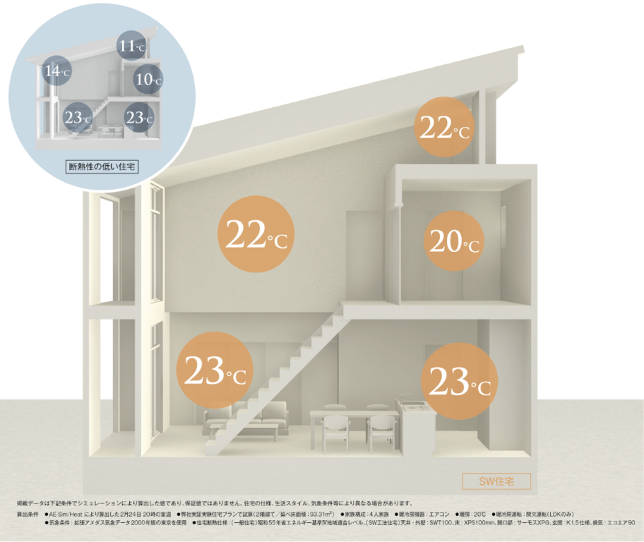 さらに、冬場の就寝前に暖房を止めてから眠ったら朝の室内が寒かったという室内の温度変化も、保温性が高い家では軽減されます。