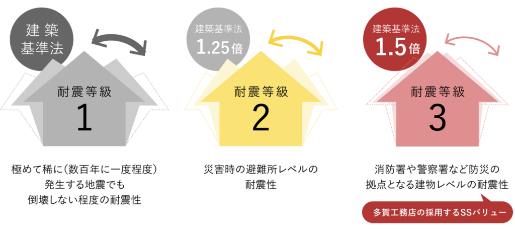 これは、建築基準法で定められた耐震等級1のおよそ1.5倍の耐震性で、消防署や警察など防災の拠点となる建物の基準に相当します。