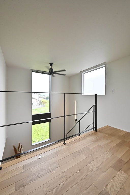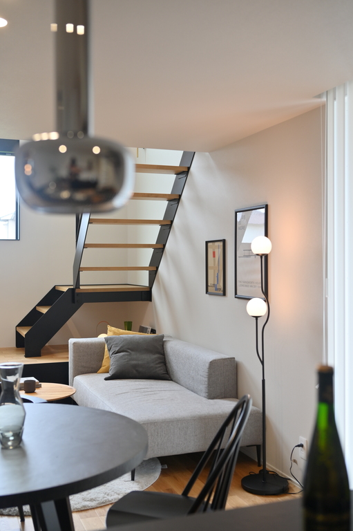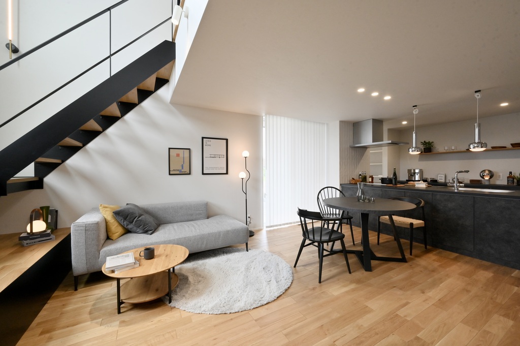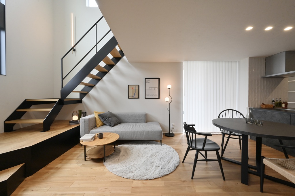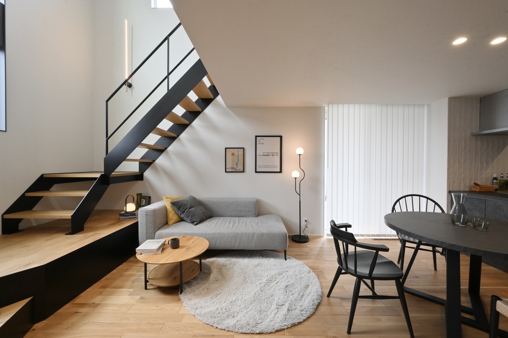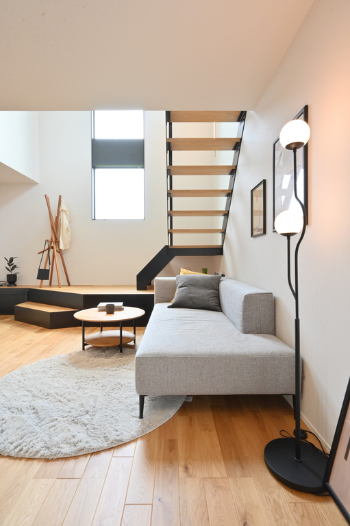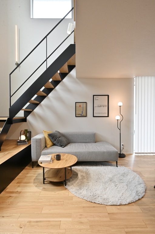 直線的なアイアン階段とシャープなライン照明が、余白のある空間を引き締め、都会的な印象をプラス。