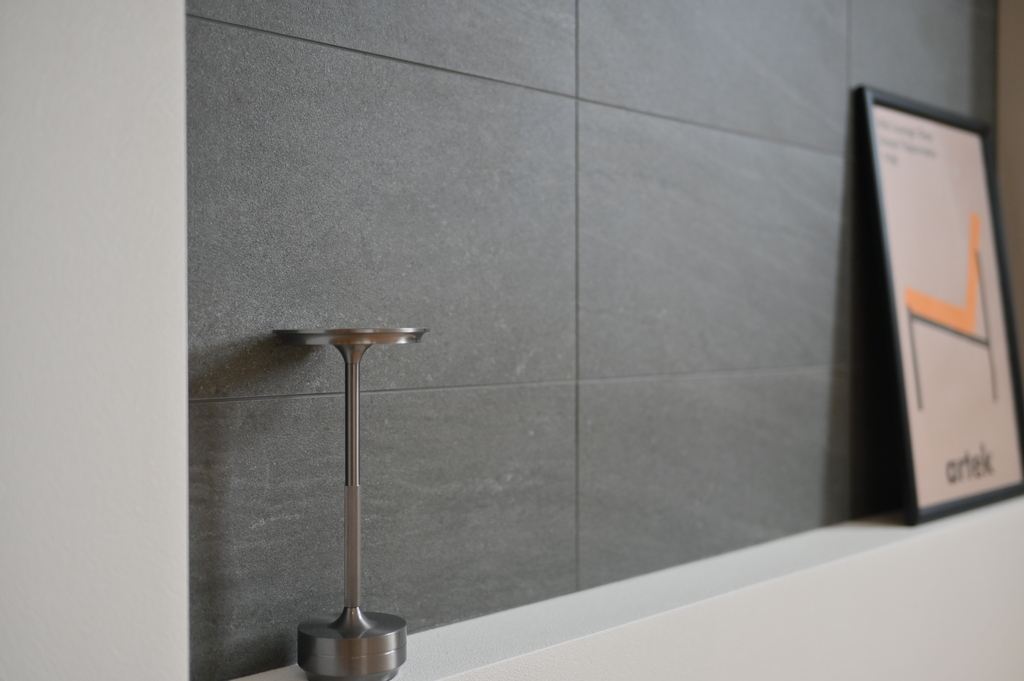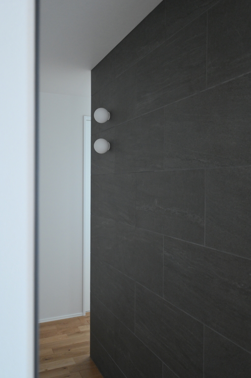 壁一面に施したグレーのタイルが、空間に静かな存在感を与える。