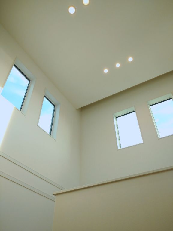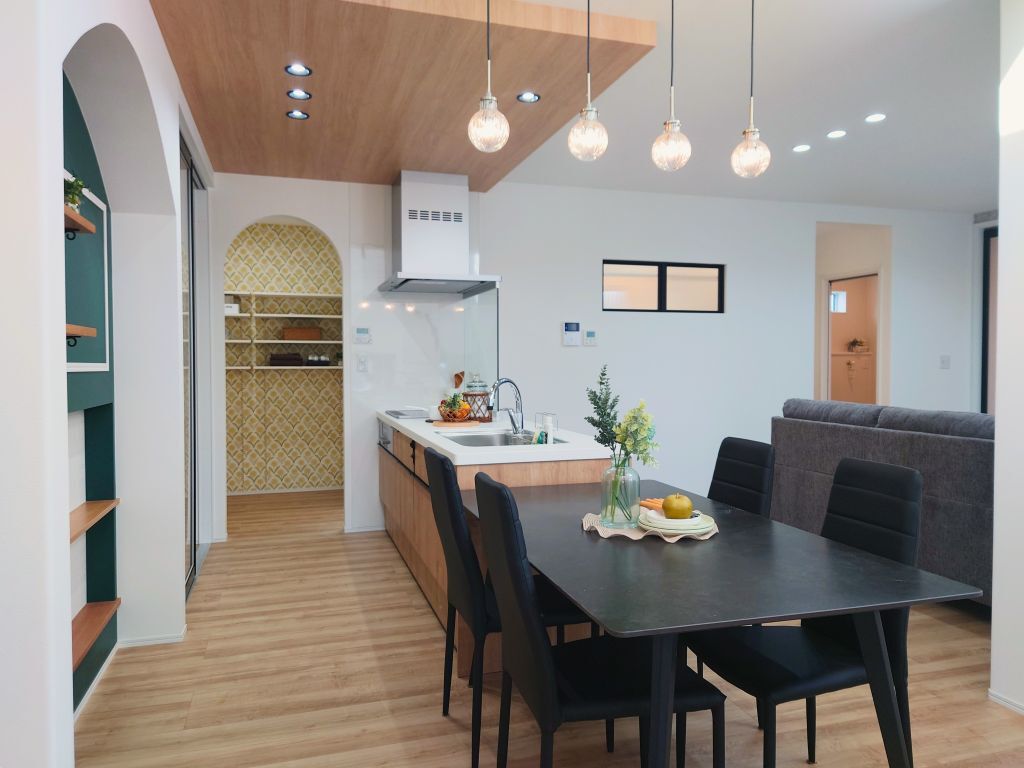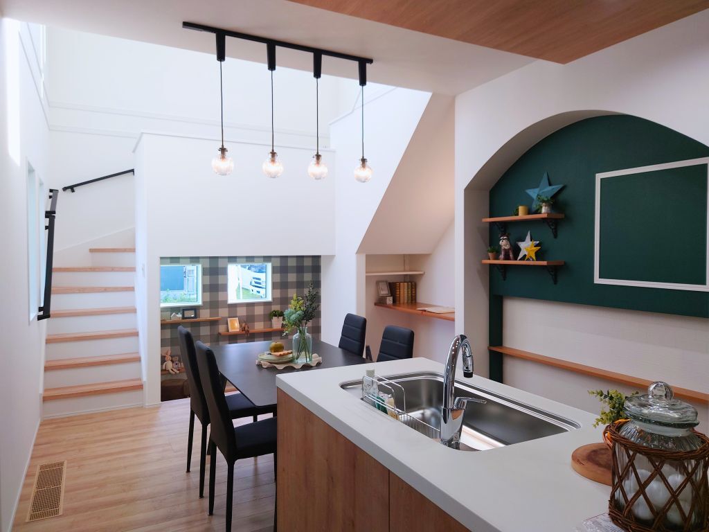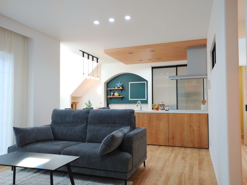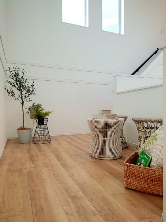 自然光が優しく差し込み、明るい空間を作る吹き抜けのある22帖LDK。開放的で広々としたリビングは風通しもよく、家族みんなが心地よい時間を過ごせます。
