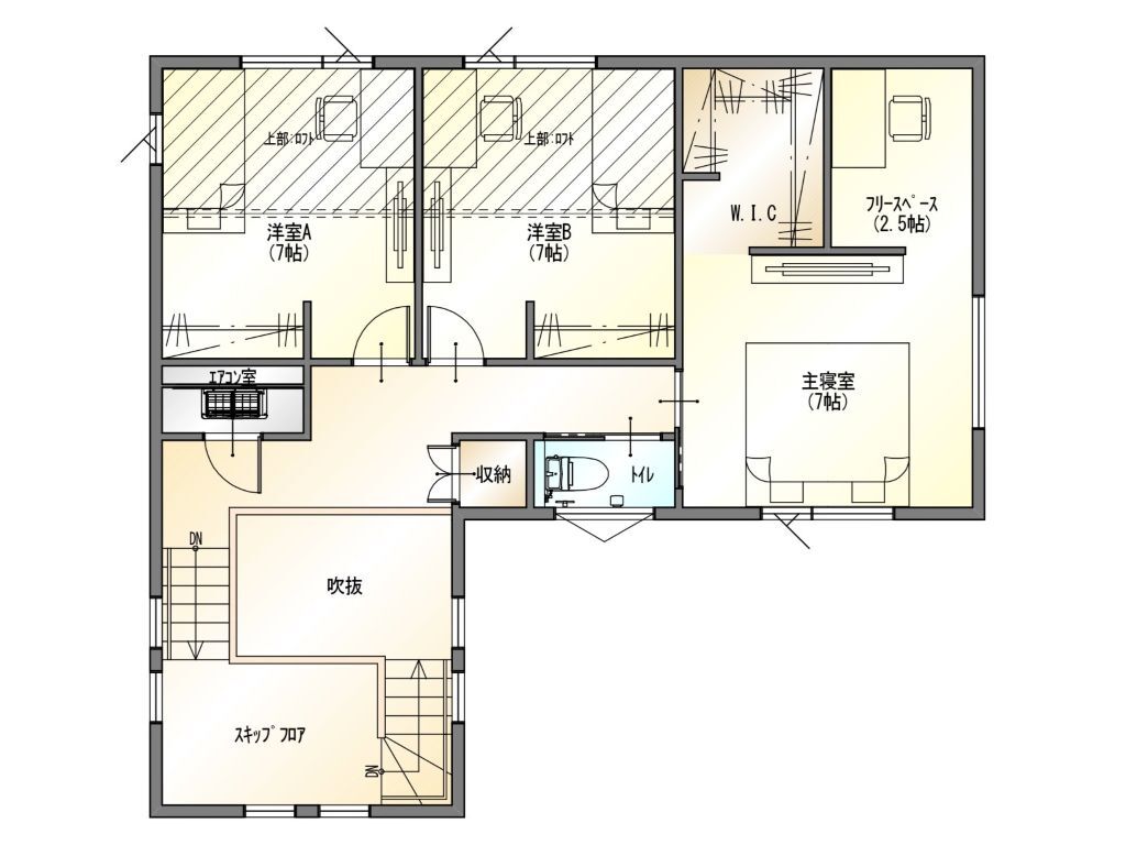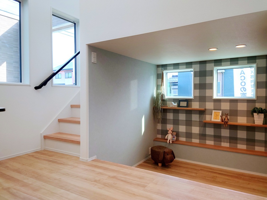 7帖のゆとりある子供部屋にはそれぞれロフトがついています。荷物をまとめて置いておけば、お部屋の広さを最大限に活かすことができます。秘密基地のように使える特別感もあるので、寝具を上げてベッドを作ったり、趣味を楽しむスペースとして使用したりと、ライフスタイルに合わせて自由にご利用いただけます。