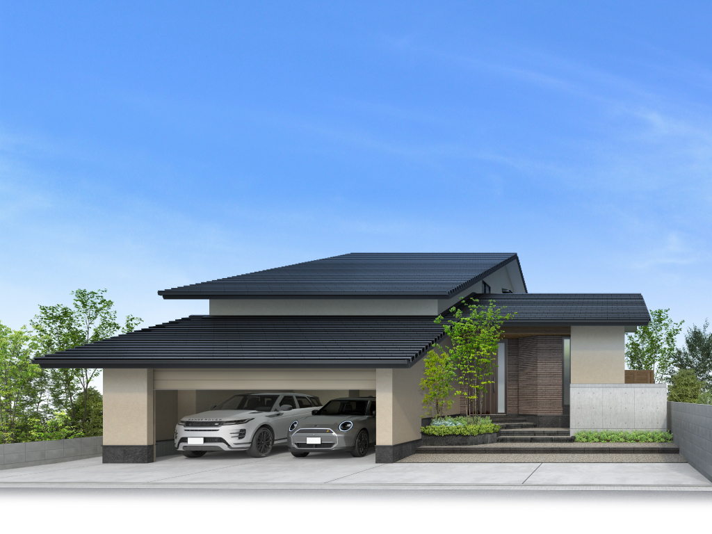 美しい外観の大屋根の姿が住まいの品格を感じさせる。