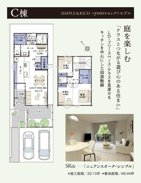 LD・フリースペース・テラスを見渡せるキッチンを中心にした回遊動線が心地よい。