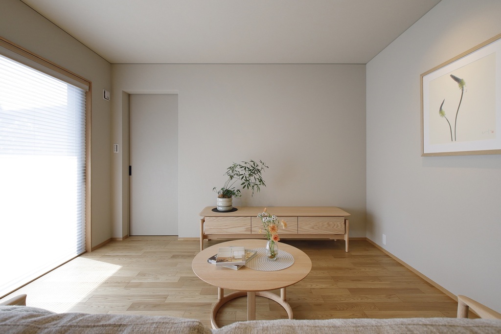 TVボードの背面にある洋室の扉は、カラーや取付方法を工夫し壁面に馴染ませることですっきりとした空間になっています。