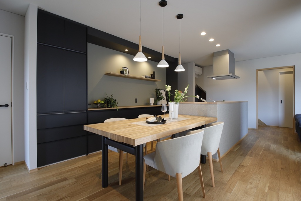 カップボードはダークカラーを効かせることで、すっきり感と心地よさを両立させました。色やラインを整えているため、好きなものを自由に飾っても美しくまとまります。