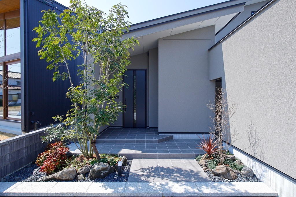 塀と車庫のゲートで両サイドを締め、「ステージ」のようにデザインしたタイルのアプローチ。