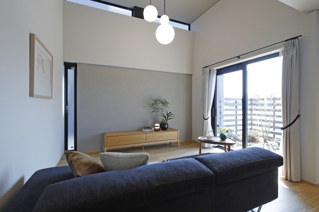 高天井+庭とのつながりで、より広々と感じるリビング空間。