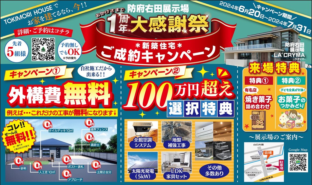 | タイトル | 【防府右田】展示場OPEN1周年特別キャンペーン!【相談会&見学会】 |