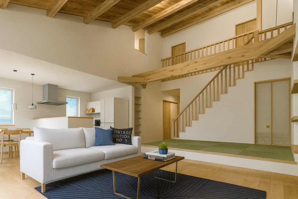 1.勾配天井の吹き抜けが開放的で心地よいリビング