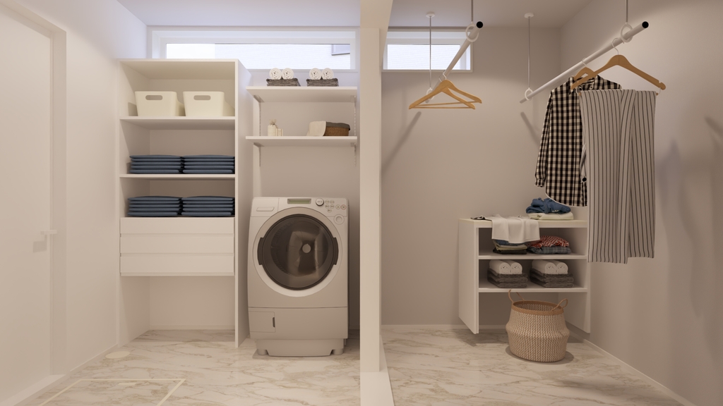 洗面所と脱衣所に加え、独立したランドリールームを確保。洗濯から室内干し、収納までが一か所で完結する効率的な動線設計です。忙しい共働き世帯にも嬉しい、家事負担を軽減する間取りとなっています。