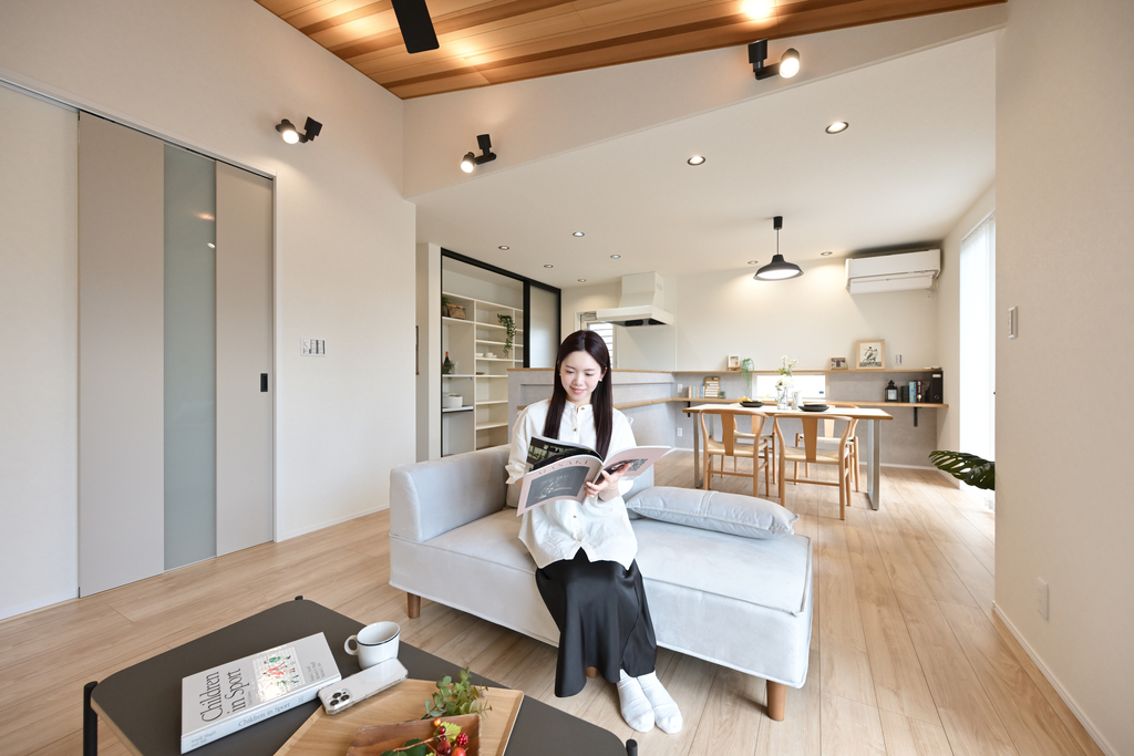 平屋ならではの勾配天井でより広くゆったりとくつろげます。