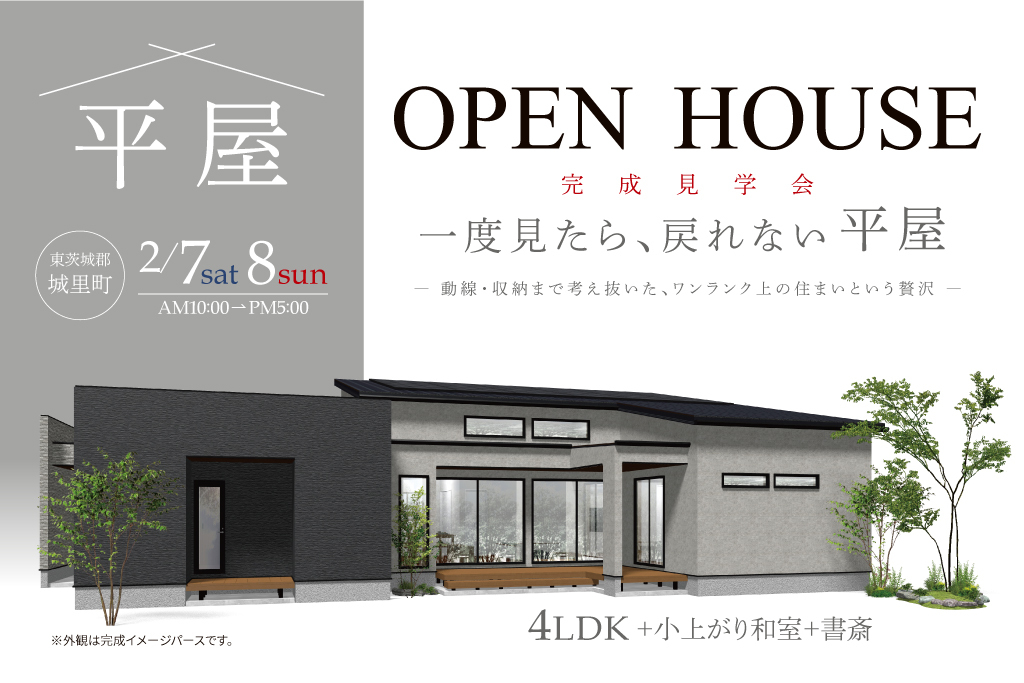 | タイトル | 東茨城郡 城里町 2/7・8 平屋 完成見学会 |