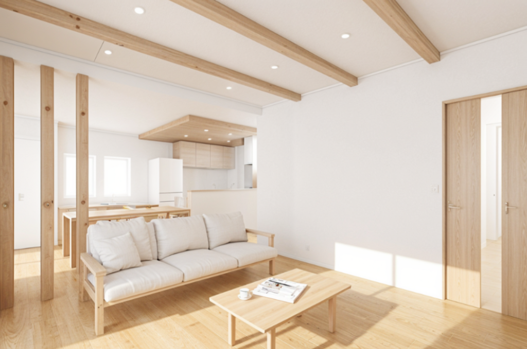 ◎リビングでは天井の梁のあらわしと、空間を支える3本の柱が木の力強さがそのままインテリアとなり、視覚的な広がりと安心感を両立させています。