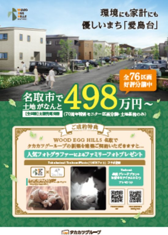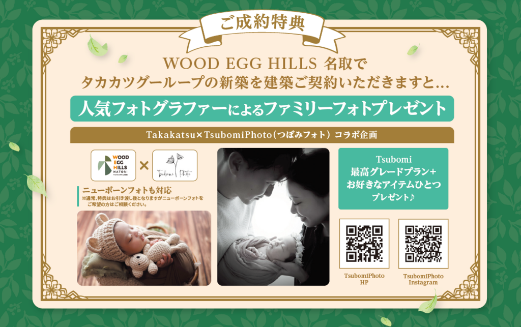 ウッドエッグヒルズ名取でタカカツグループの新築シリーズを建築ご契約いただきますと、TsubomiPhoto(つぼみフォト)最高グレードプラン+お好きなアイテムひとつをプレゼント♪
