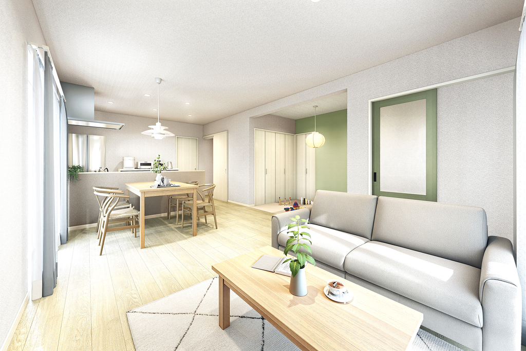 空間全体に柔らかさと温かみが生まれ、長く過ごしたくなる心地よい住まいに仕上がっています。リビングのグリーンの扉がアクセントになっています。
