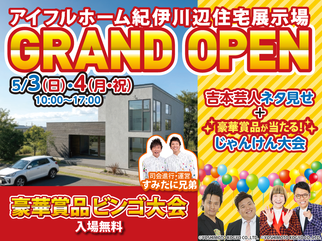 豪華賞品ゲット!ビンゴ大会開催や「ミサイルマン」と「女と男」のネタ等、GWは紀伊川辺住宅展示場へお気軽にお越しください!