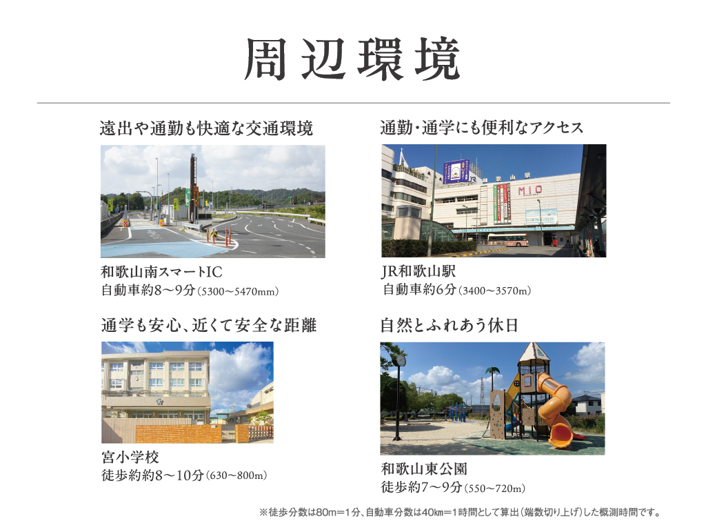 子育て世代にも嬉しい住環境。和歌山南スマートICへ車約9分、宮小学校へ徒歩約10分、和歌山東公園へ徒歩約9分と、交通・教育・自然が身近に揃う好立地です。