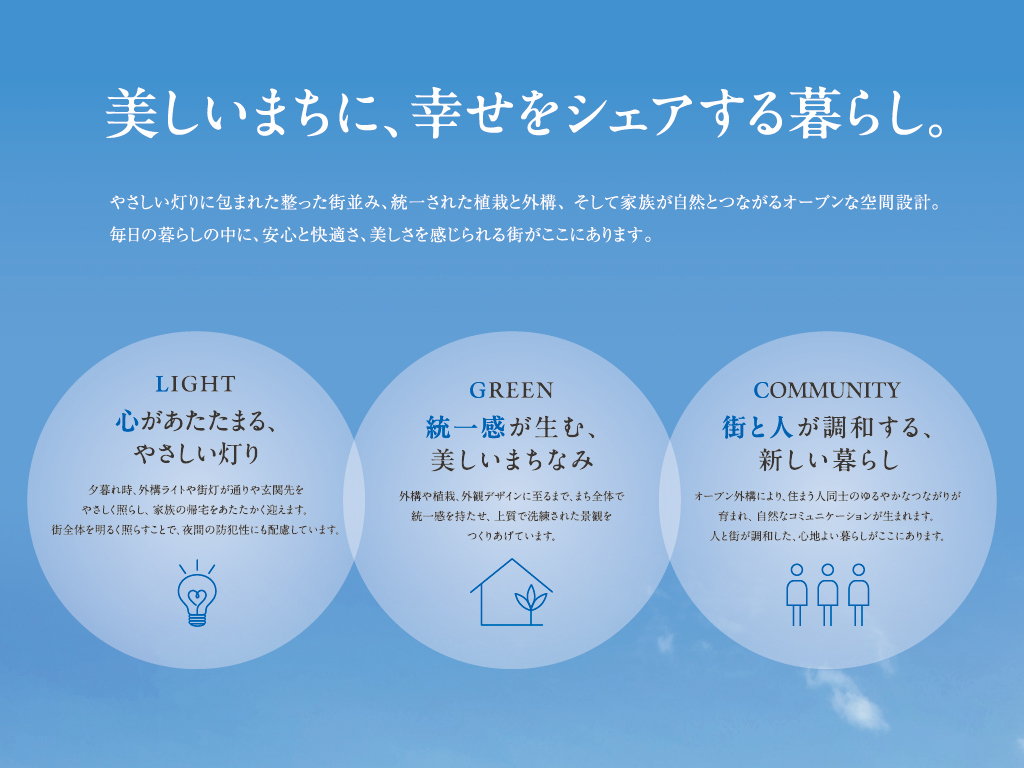 外観デザインから植栽に至るまで美しく整えられた街並みには、暮らしやすさと温もりが息づいています。夕暮れ時には街灯のやさしい灯りが街を包み込み、住まう人を心地よく迎えるホームタウンです。